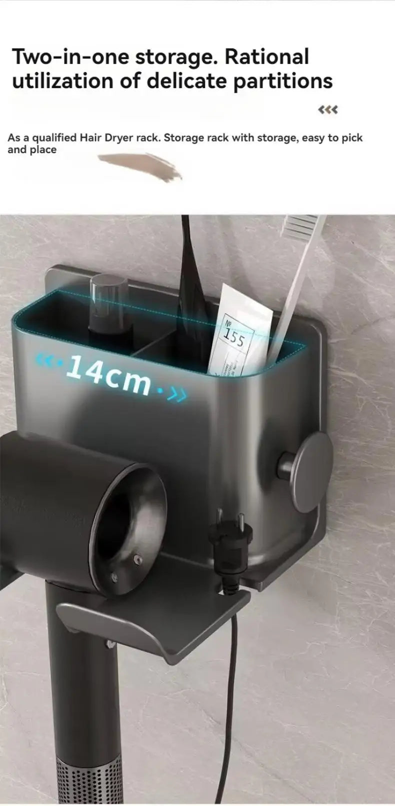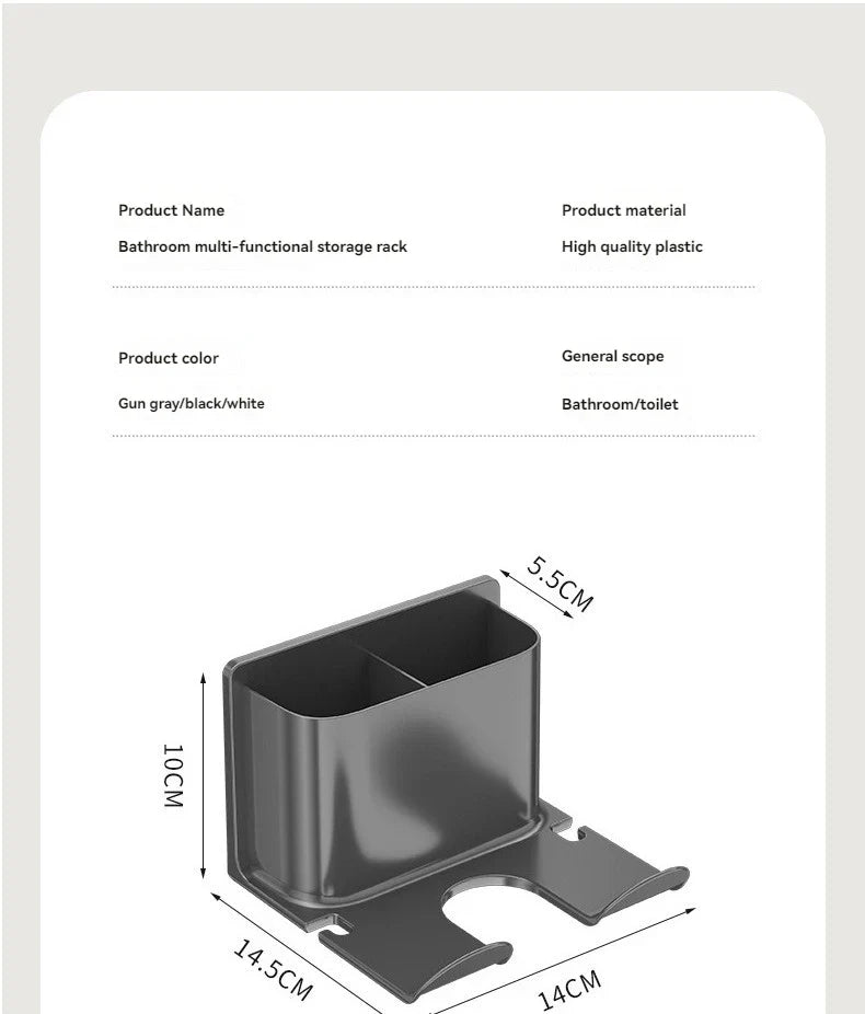 • Multifunctional Storage Rack :This hair dryer storage rack is a versatile solution for your bathroom storage needs. It can hold hair dryers, dressing table items, and other bathing accessories, keeping your space tidy and organized.