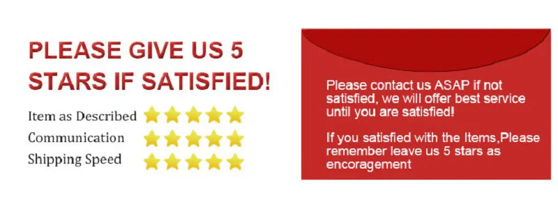1. Please leave 5 star feedback if you're satisfied with our products and service, we will appreciate it (Item as Described 5 stars, Communication 5 stars, Shipping time 5-stars).