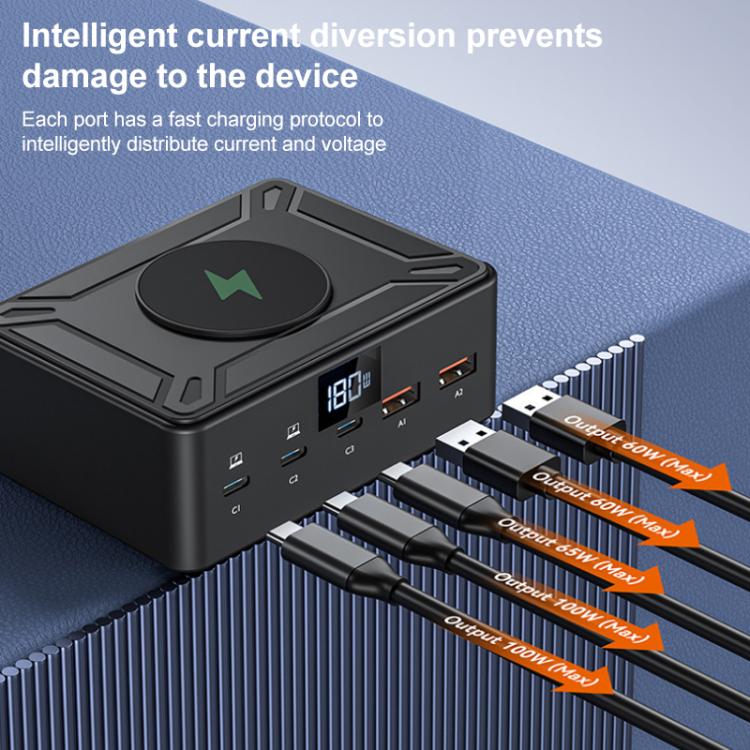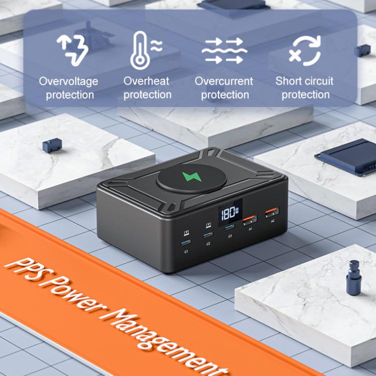 190W LED Display 3 x Type-C + 2 x USB Multi Ports Charger Support QI Wireless Charging, 190W