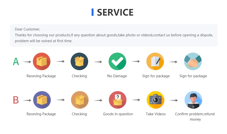 2. If you can't get your items in time, please contact us first, we will check and solve it for you soon.