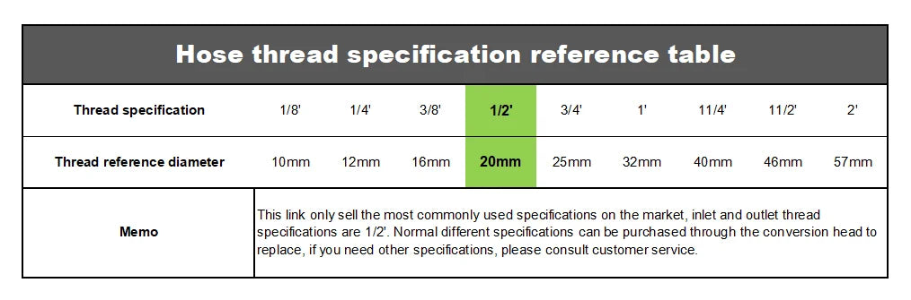 · Hose inlet and outlet thread specification :here only sell 1/2' (others can refer to following table)