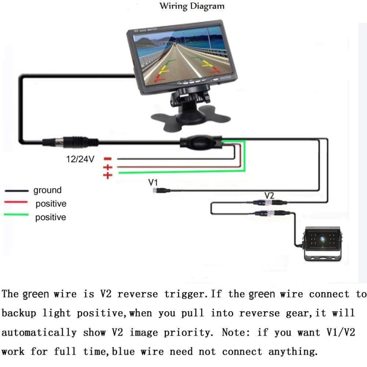 3. Red wire to positive, black wire to ground. The blue wire is V2 reverse trigger.