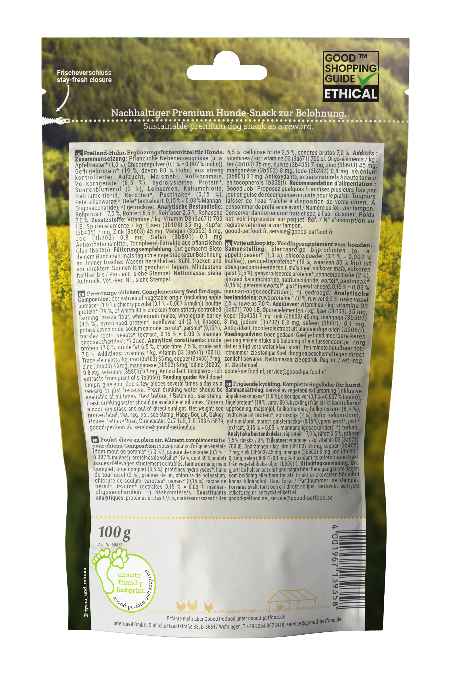 Our free-range chickens only get natural feed. You can taste it. In addition, there is valuable whole grain that provides energy for in between. Our soft gooodies are easily digestible. We generally do not use additives such as sugar, artificial colours, flavourings or preservatives. Instead, we rely on the natural power of high-quality ingredients. The club-shaped dog treats from Goood with chicken and parsnip are also good for digestion and metabolism.