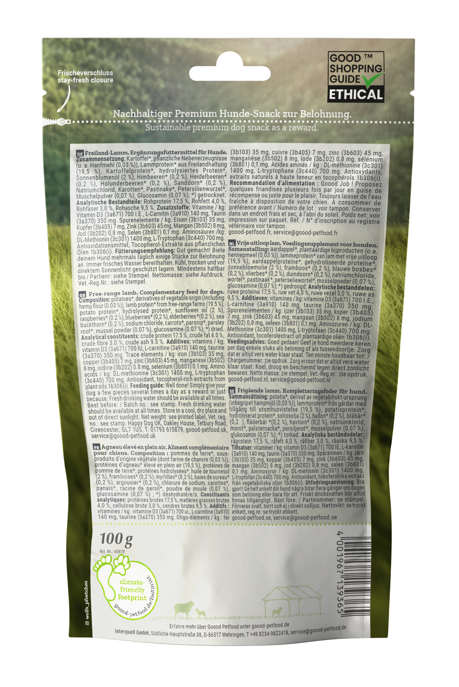 Our lamb comes from controlled free-range husbandry. The sheep and lambs can enjoy the fresh air and graze all year round. This is one of the reasons why our Soft Gooodies taste so juicy. The natural recipe for our dog treats does not contain sugar or artificial colours, flavours or preservatives and is also tasty for sensitive dog stomachs. Instead, we mix the valuable green-lipped mussel, which is good for bones and joints.