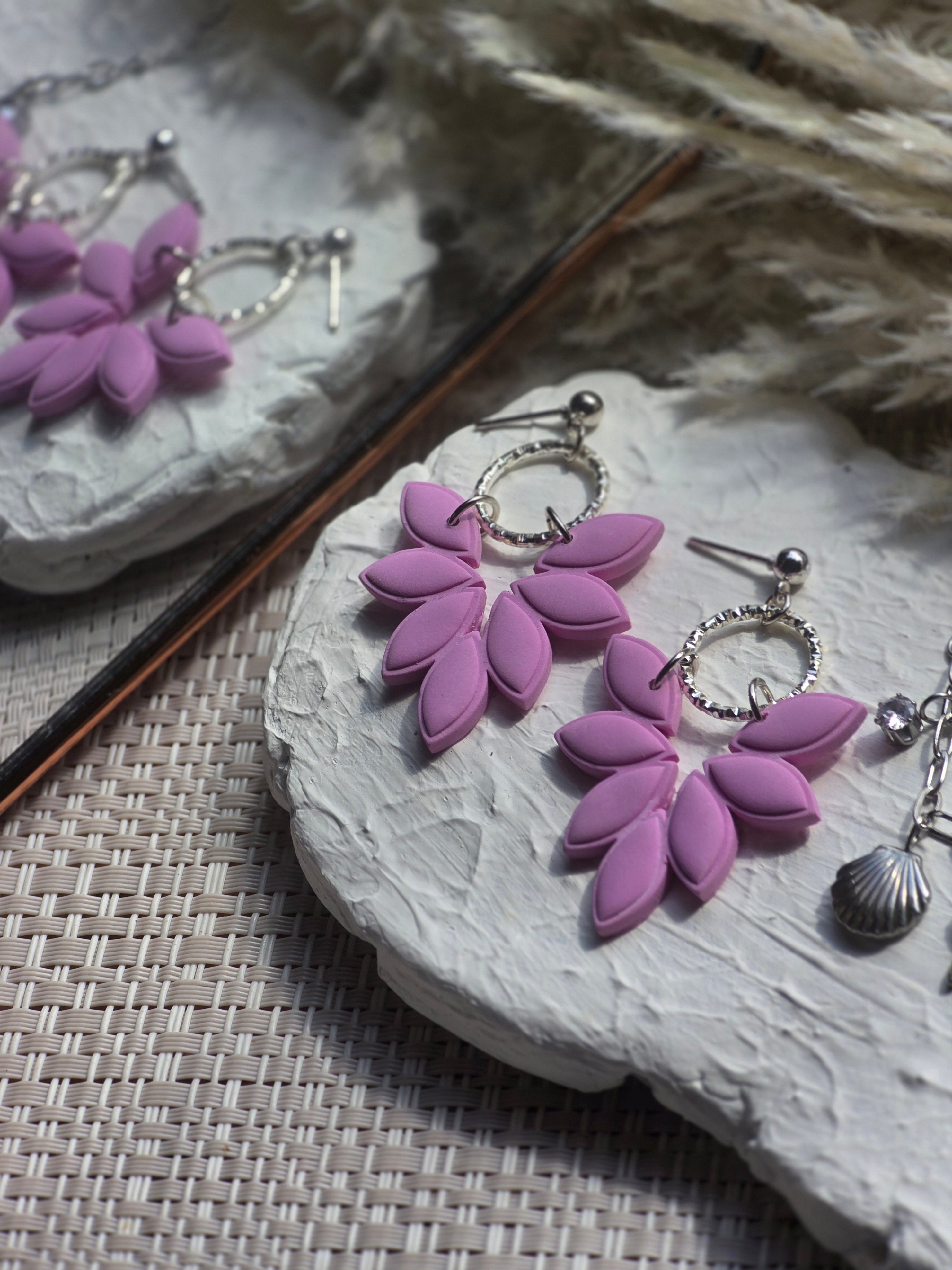 Elevate your style with our gorgeous Amber earrings, in this luscious shade of pink. The beautiful leaf design, can be accented by your choice of gold or silver charms, adding a touch of your own style. Elevate your outfit with our Ambers. A must-have for any fashion-forward individual.