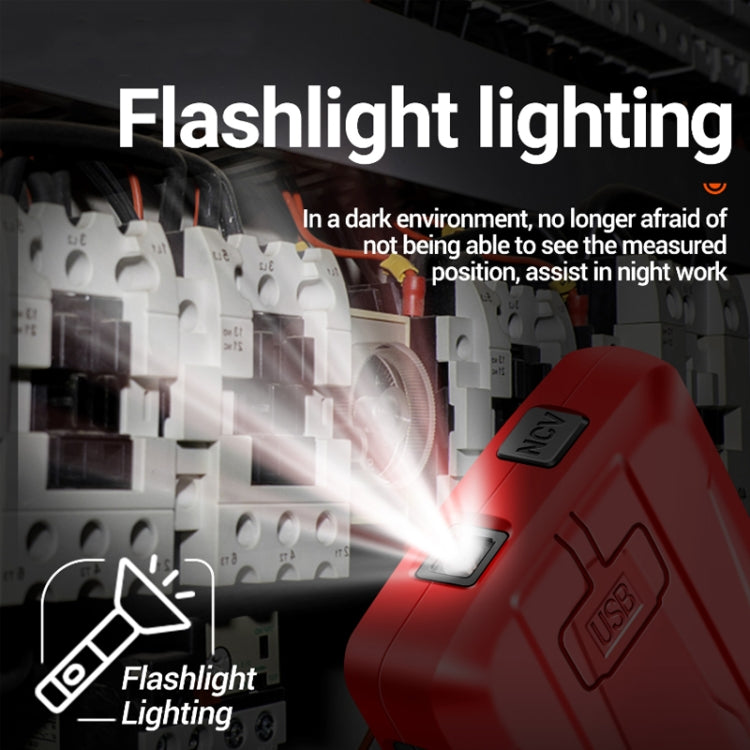 4. NCV non-contact induction, using NCV sensor for induction, the closer to the power supply, the faster the alarm, the flashlight flashes red