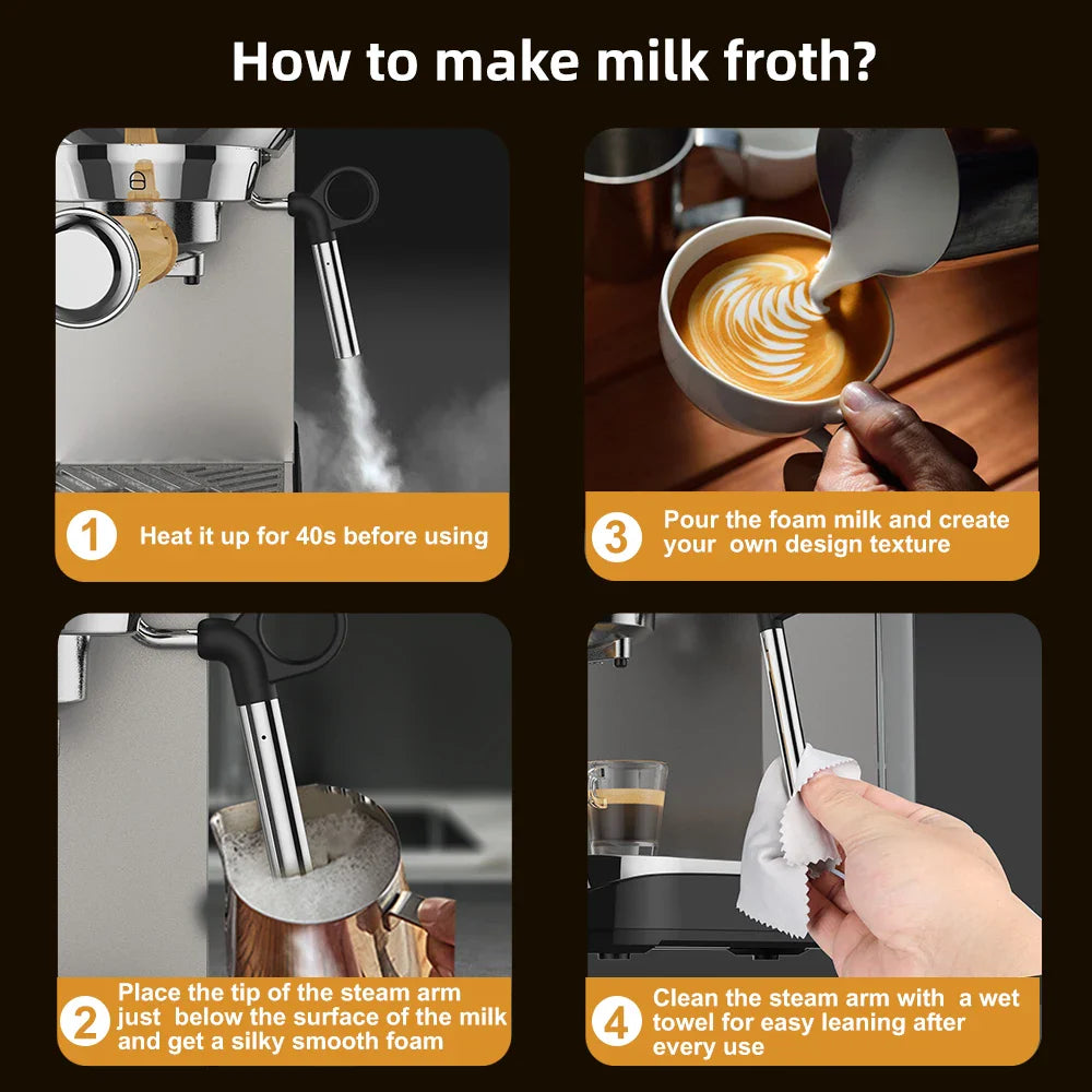 Professional Milk Steam Frother - You can rotate to adjust the position of the milk frother for easier frothing. Just wait for 1-2S to drain the condensed water from the frother before frothing the milk so that you can make the milk froth denser and more mellow.