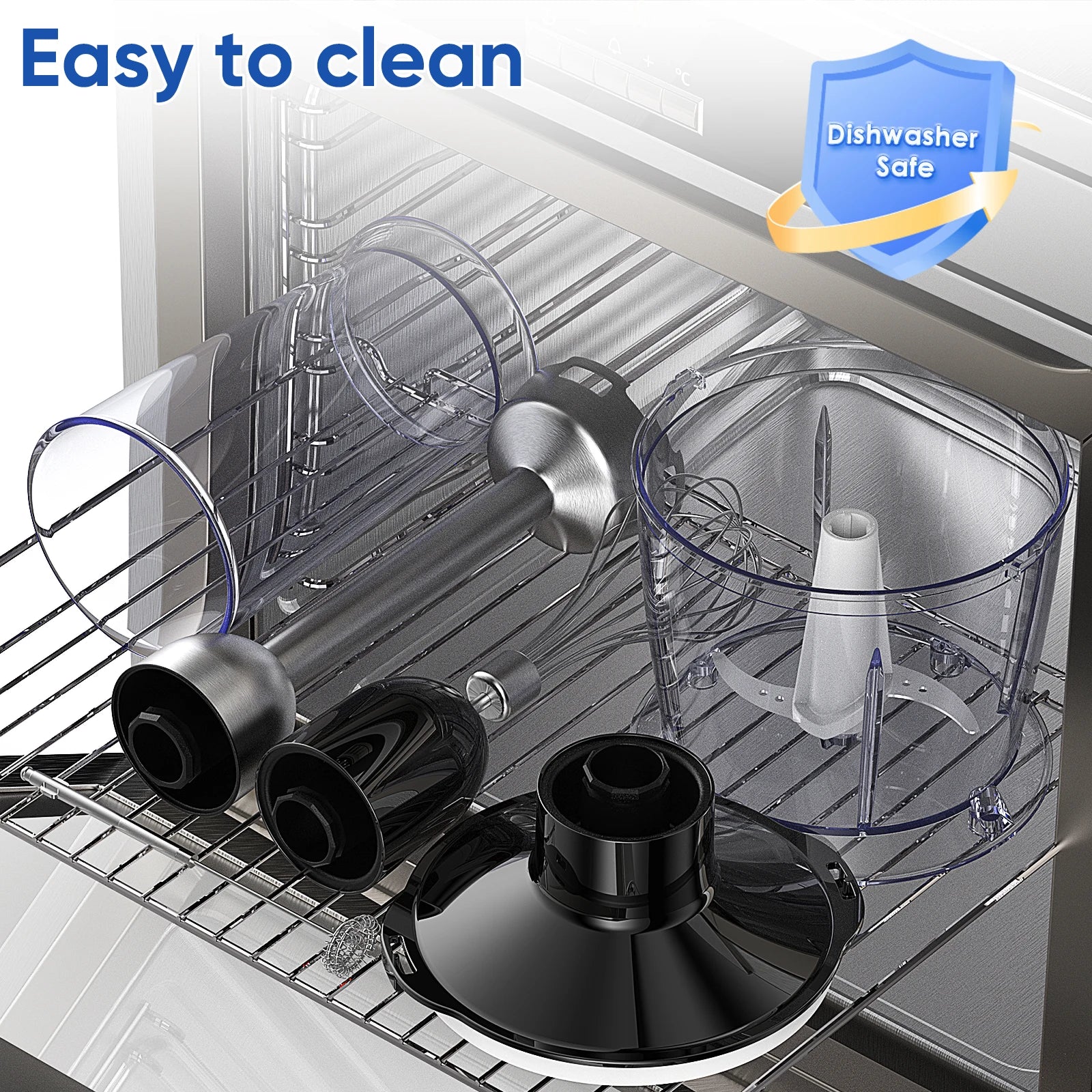 4. EASY TO CLEAN:The detachable blending, whisking and frothing parts are made of professional-grade stainless-steel, easy to be cleaned with warm soapy water and dishwasher safe. (Note: please don't immerse the motor in water.)
