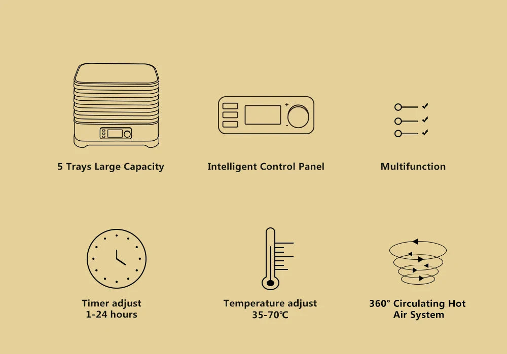 TIMER & TEMPERATURE ADJUSTABLE - Features adjustable timer and temperature functions; Drying temperature can be set from 35℃-70℃, while the time can be set from 0-24 hours; Choose the optimal time and temperature depending on the ingredients; A hot air fan will automatically switch on and off to balance the temperature;