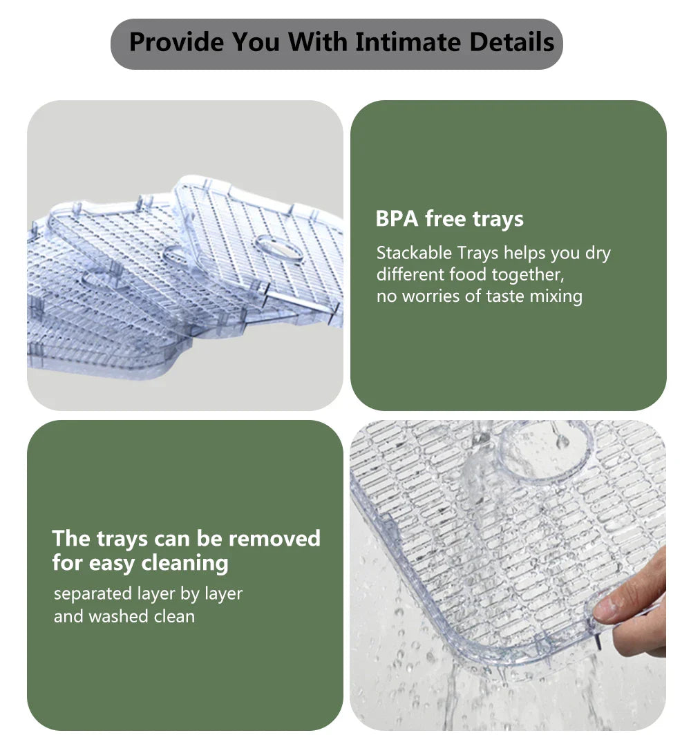 EASY TO STORE & CLEAN - The dehydrator is detachable and the trays are dishwasher safe, making it easy and convenient for you to clean and store; Suitable for drying fruit, vegetables, meat, herbs, mushrooms, or to make beef jerky, turkey jerky, fish jerky, and any other homemade food; Also can be used to make chews and snacks for your pets.