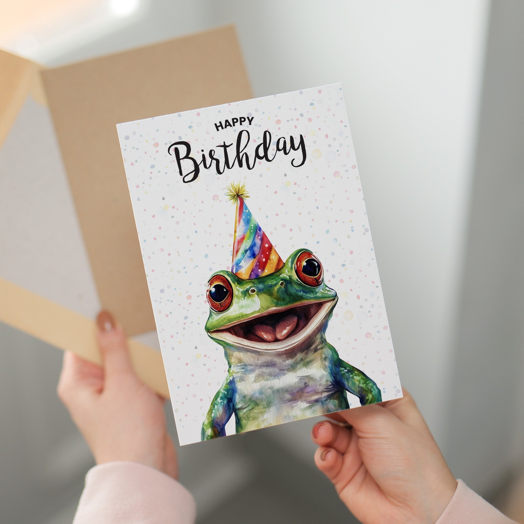 Delight the nature lover in your life with our unique Frog Birthday Card, a charming illustration card perfect for both him and her. This custom frog card is an ideal gift for anyone who appreciates whimsical art and eco-friendly practices. Each card is crafted from 100% recycled materials, showcasing the natural allure of recycled materials with delightful specks and dots. Paired with a brown kraft envelope, this frog design gift stands out as a thoughtful and sustainable choice. Whether you're searching for a birthday card for him or her, this nature-inspired card is sure to make a lasting impression. Shipped in a sturdy "Do not bend" board-backed envelope, your card will arrive in perfect condition, free from plastic. Plus, with every purchase, you're contributing to global reforestation projects through The GoodAPI, making your gesture even more meaningful. Designed and printed in our cosy home studio in Wool, Dorset, this eco-friendly card is ready to be dispatched within 1-2 business days, ensuring it arrives just in time to celebrate their special day. Order now and bring a smile to their face with this delightful frog birthday card!