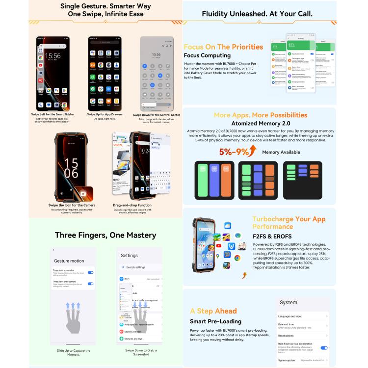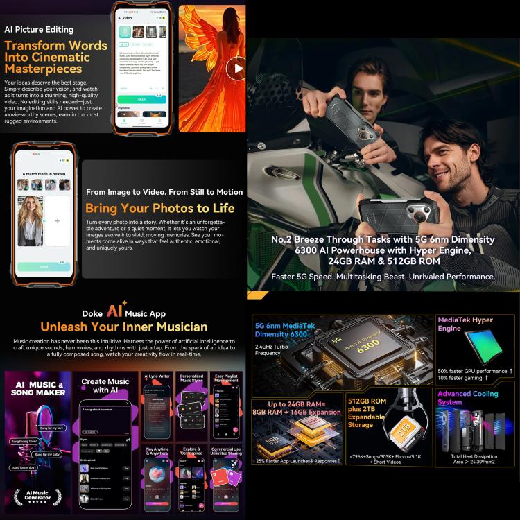 1. CPU: MediaTek MT6835V/TZB Dimensity 6300, octa-core, Arm Cortex-A76 up to 2.4GHz x 2, Arm Cortex-A55 up to 2.0GHz x 6
