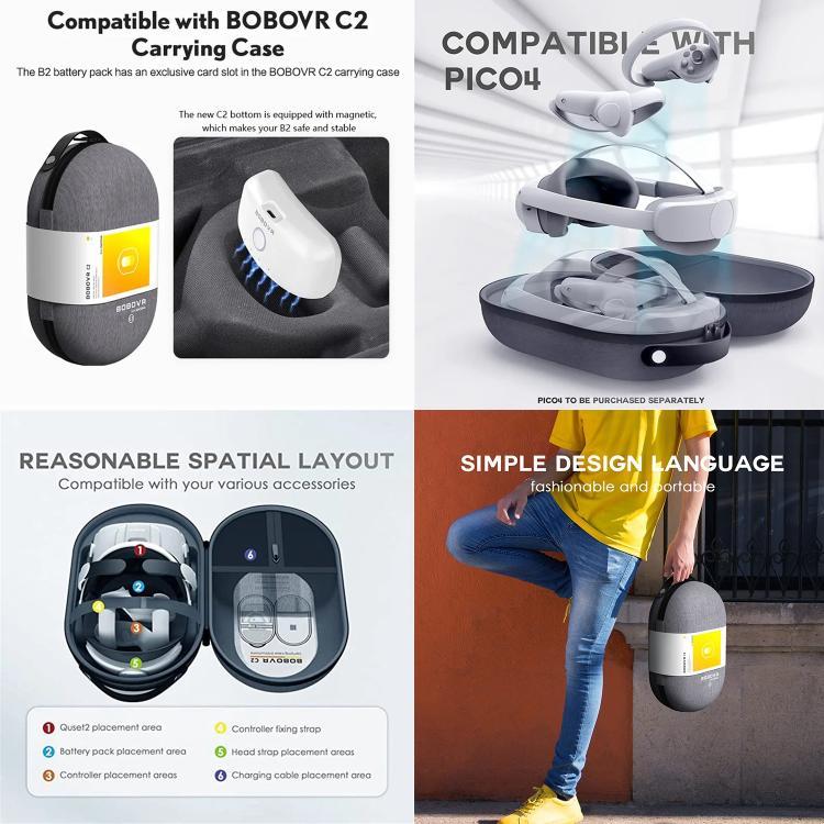 1. C2 Portable pack designed for Quest2 and BOBOVR M2 features high compatibility and large storage space. As long as the headband is less than 15cm (6in) high, it can be put in. Compatible with official Elite headbands and various types of straps (DAS wristbands are not currently supported)