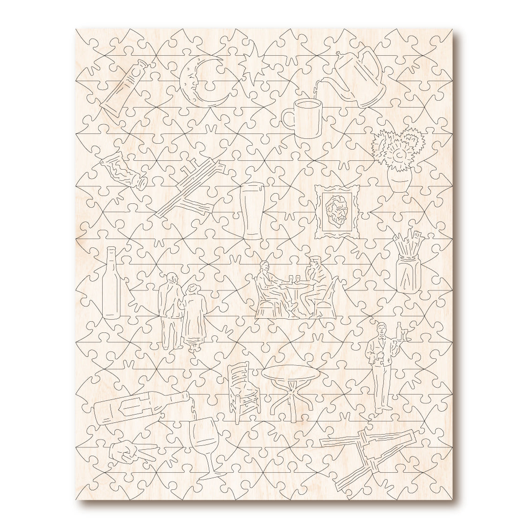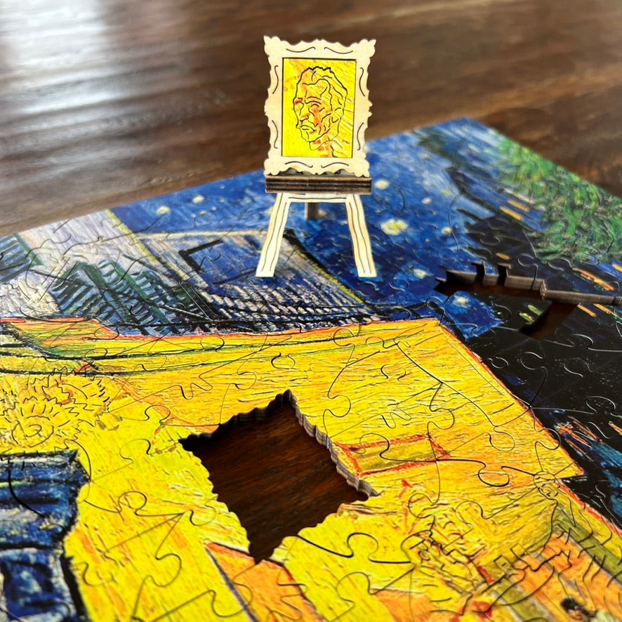 Immerse yourself in the enchanting world of Vincent Van Gogh with this wooden jigsaw puzzle. With 250 irregular and whimsical shaped pieces, it recreates the iconic Cafe Terrace At Night painting. Crafted with precision, this masterpiece is a delightful challenge for puzzle enthusiasts and art lovers alike.
