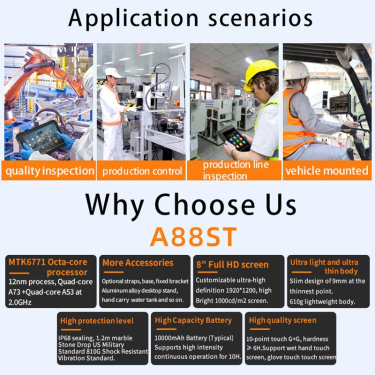 3. Screen: 8 inch IPS, 1280x800 resolution, G+G TP touch screen, hardness more than 7H, support wet hand touch screen, glove touch screen