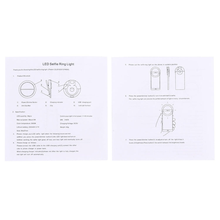 Charging Selfie Beauty Light For iPhone, Galaxy, Huawei, Xiaomi, LG, HTC and Other Smart Phones with Adjustable Clip & USB Cable