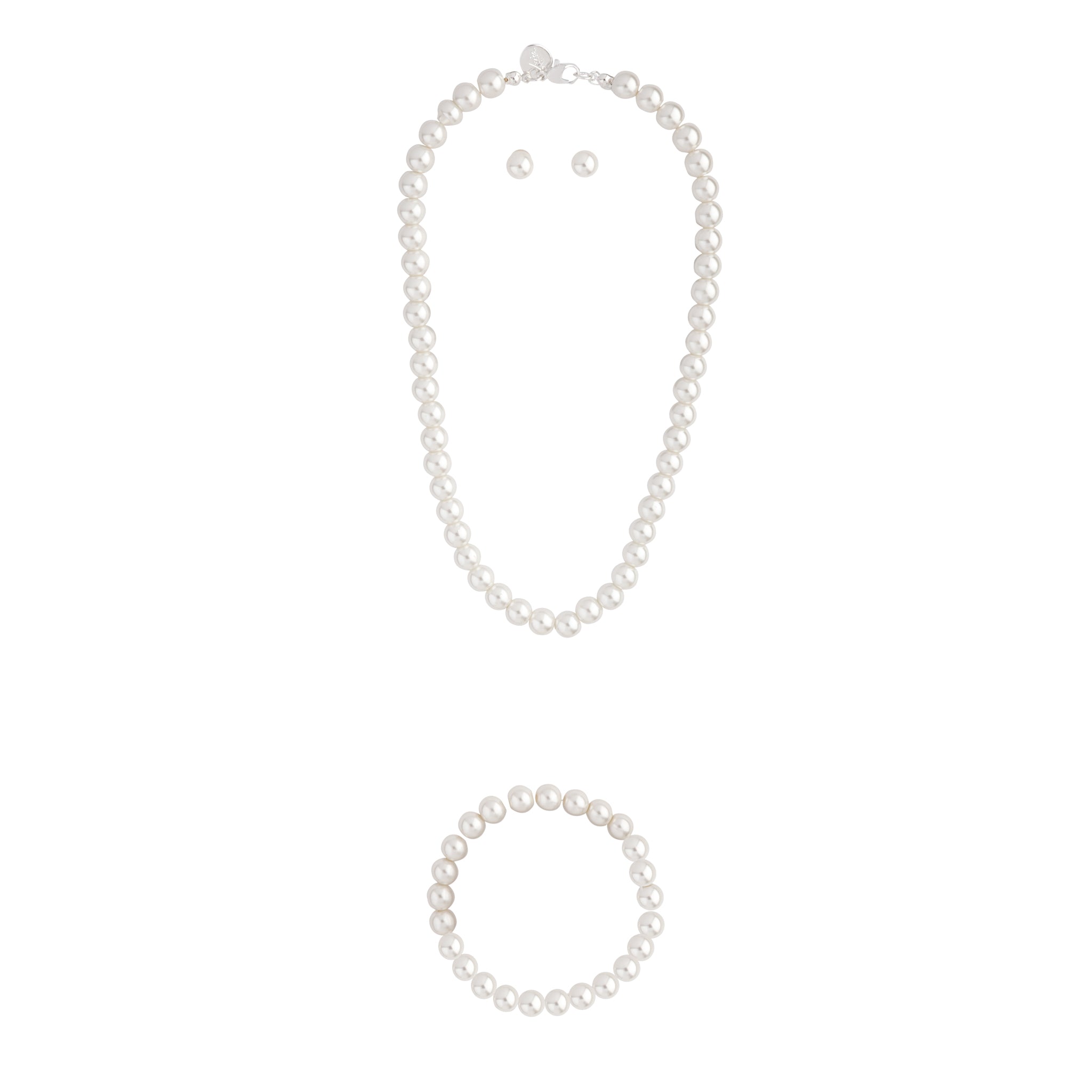 This jewellery set comes with a bracelet, necklace and earrings in a white imitation pearl design.