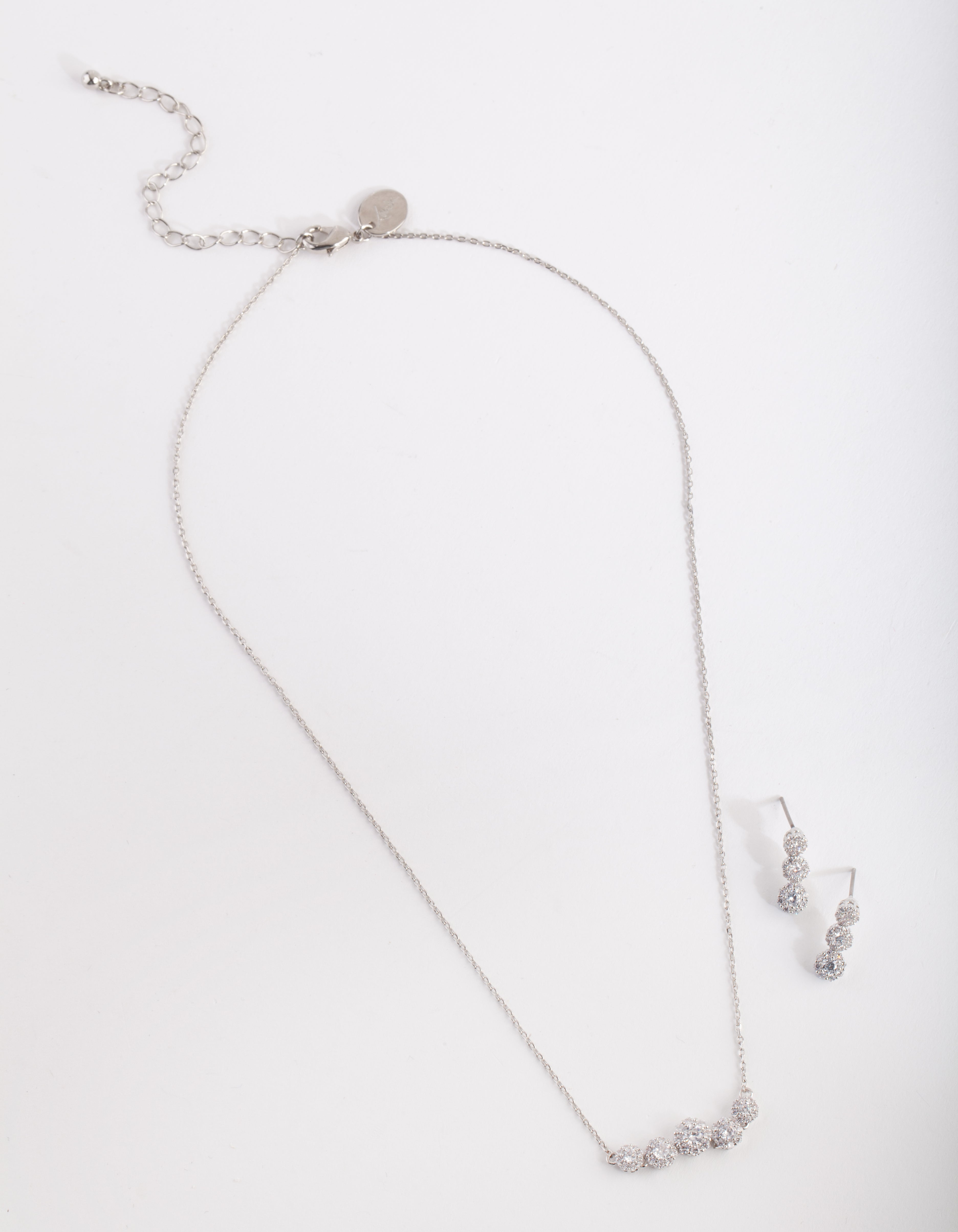 Made with diamond simulants - crystals that are cut to be indistinguishable to the naked eye from a true diamond, this set features cubic zirconia encrusted flower row drop earring and a fine chain neckalce with a matching row of floral pendants.