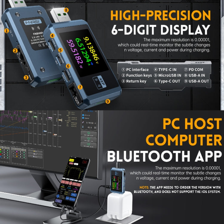 FNIRSI FNB48P USB Mobile Phone DC Power Charger Detector, Color:, Bluetooth Blue, Without Bluetooth Black