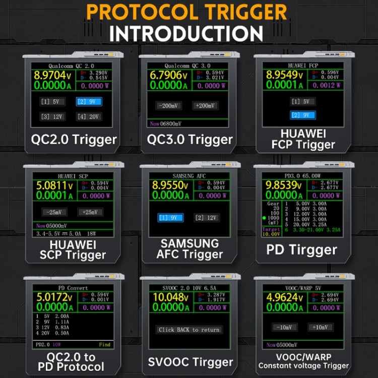 12. Protocol detection: For Apple 2..4A, QC2.0, QC3.0, PD, For Samsung AFC, For HUAWEI SCP, For OPPO VOOC, DASH, WARP, SuperVOOC, MTK-PE