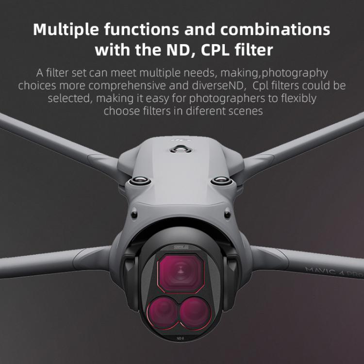 Features1. ND filter is very suitable for DJI Mavic 4 Pro, with multi-layer coating, waterproof, scratch-proof, dust-proof and oil-proof, protecting your Mavic 4 Pro lens from all-round damage. At the same time, it reduces the amount of light entering the Mavic 4 Pro lens, helps to avoid overexposure, resists scattered light and increases color saturation, making the picture more transparent and gorgeous. ND 8/16/32/64 filters provide 3/4/5/6 levels of light reduction respectively. When using, you can reduce the shutter speed (shutter speed using ND* lens = shutter speed x* when not using ND lens) to make the picture have appropriate dynamic blur. It is often used to shoot landscape subjects such as waterfalls, flowing water, waves, mountains, rivers, etc., to achieve blockbuster effects such as misty flowing water and night light tracks.