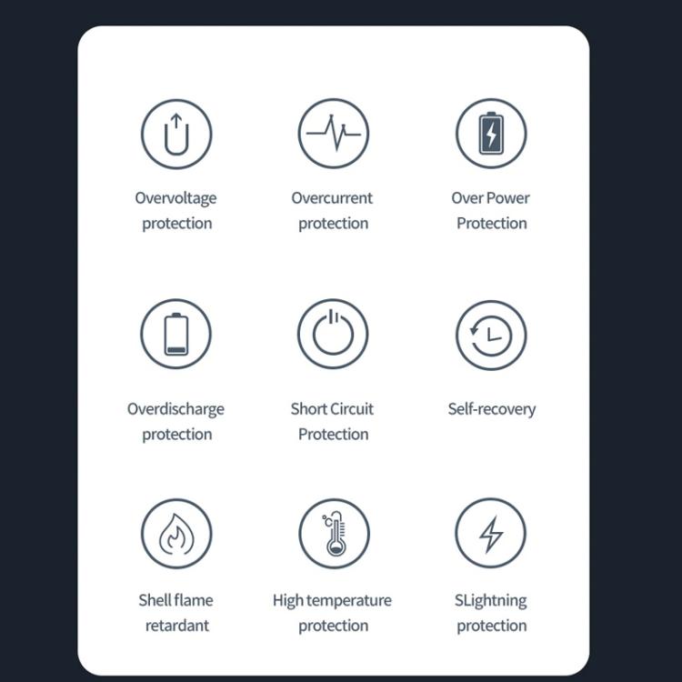 3. Advanced Safety Protection: Built-in 9-layer safety system: Over-voltage, over-current, over-power, over-discharge, short-circuit, over-temperature, surge (lightning strike), flame-retardant casing, and recovery protection.