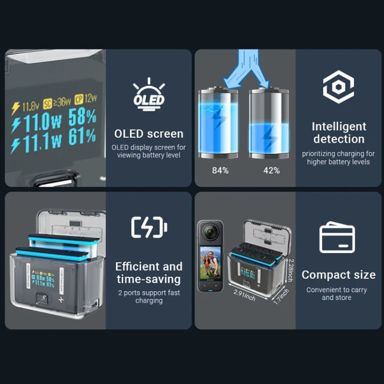 1. Suitable for Insta360 X4 action camera two-way charging butler, can accommodate 2 batteries for charging, and can also use battery power to charge mobile devices