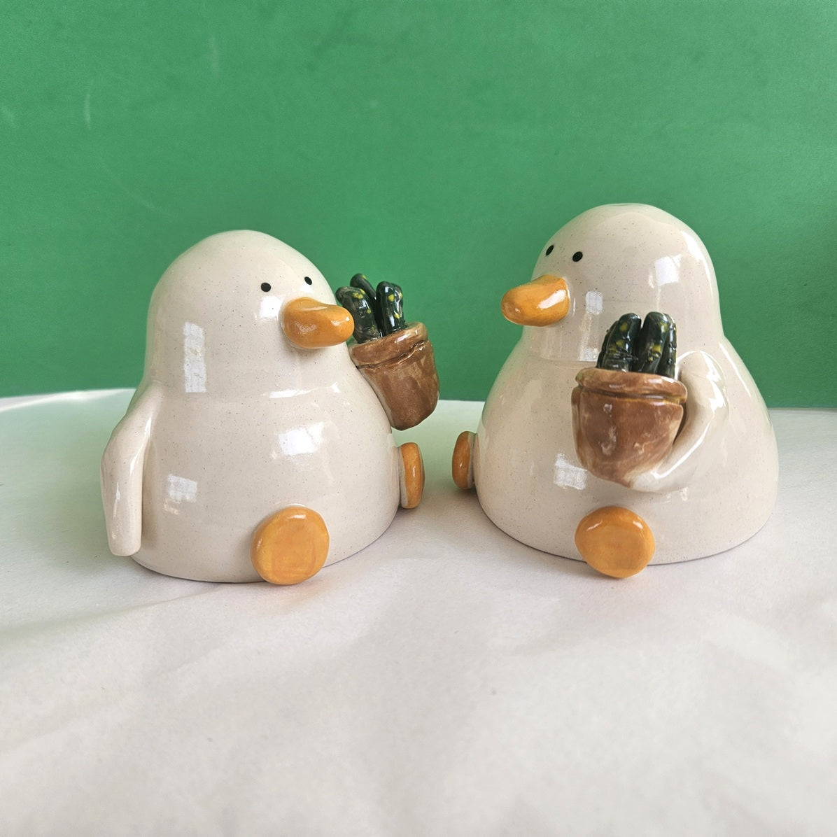 A gift for the gardeners in your life, Grant is the ducky companion who loves to grow organic. A handmade ornament, thrown on the potter's wheels, he's the ideal pal to watch your garden grow. I've made him so he's holding a succulent plant pot under the wing.