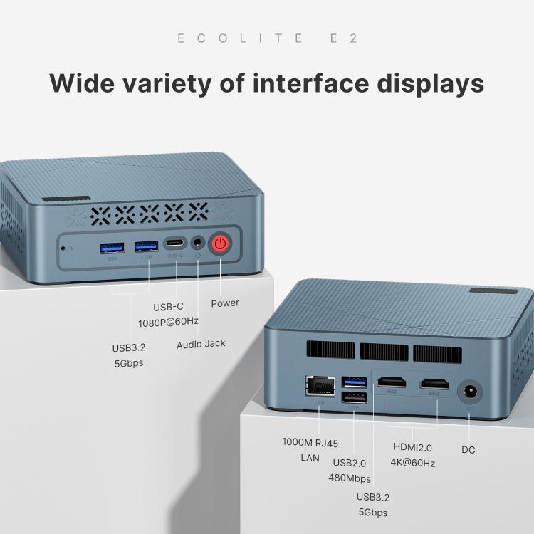 6. Interface: DC port x 1, USB3.2 x 3, USB2.0 x 1, 1000M RJ45 x 1, HDMI 2.0 x 2, 3.5mm Audio Jack x 1, Type-C x 1