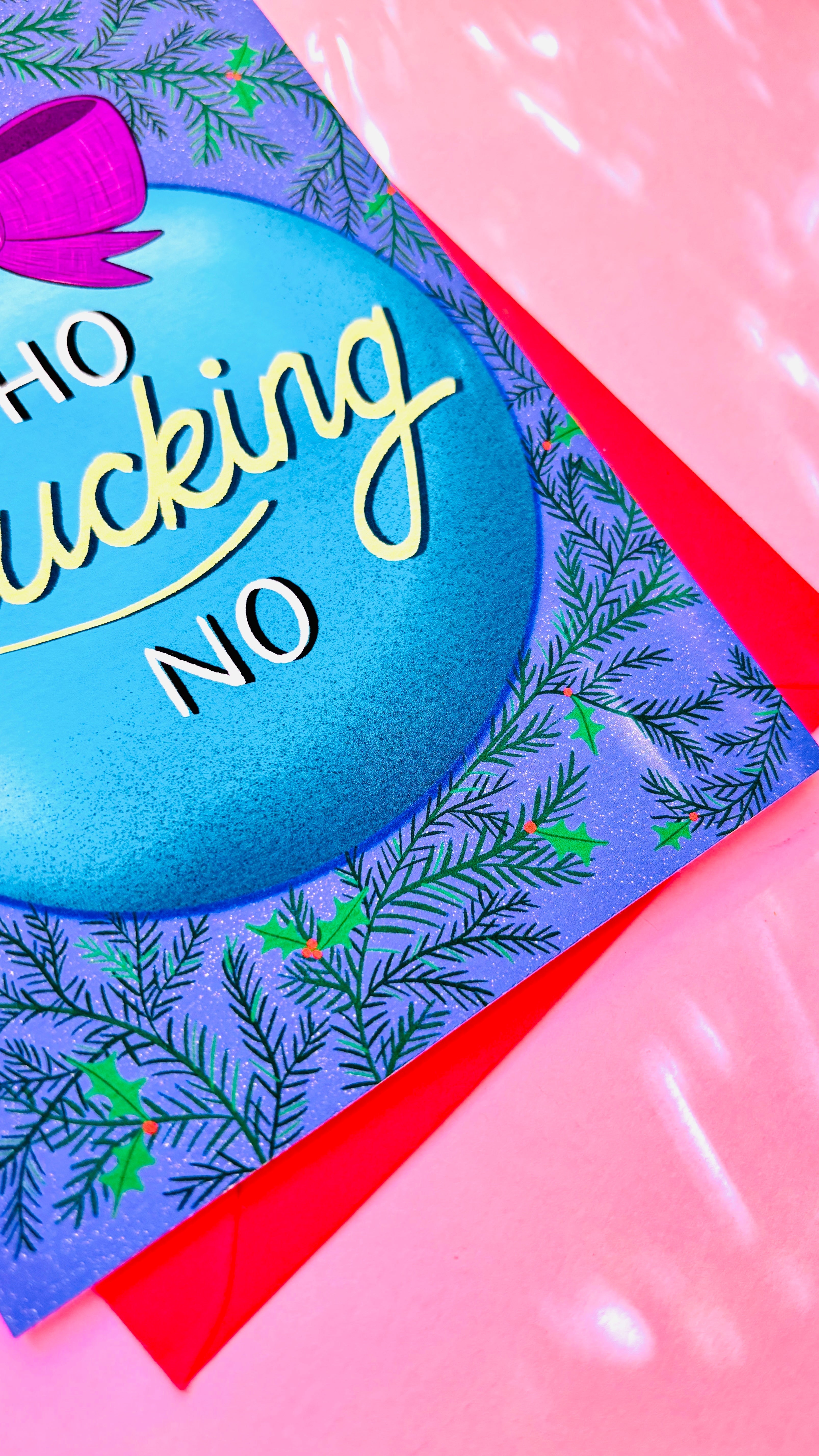 More grinch than Santa? Bring some bold, cheeky humour to your holiday greetings with this hilarious hand-illustrated Christmas card! Featuring a bright blue bauble with the phrase “Ho Fucking No” in festive lettering, this card is perfect for anyone who loves cheeky, sweary holiday fun.