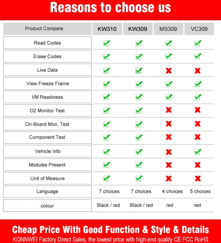 7. Views freeze frame dataThe KONNWEI KW309 OBD2 / EOBD / CAN Car Diagnostic Scanner supports all 10 OBDII test modes on all OBDII compliant vehicles for a complete diagnosis. the KONNWEI KW309 is truly the ultimate in power and affordability, allowing users to do their jobs faster.
