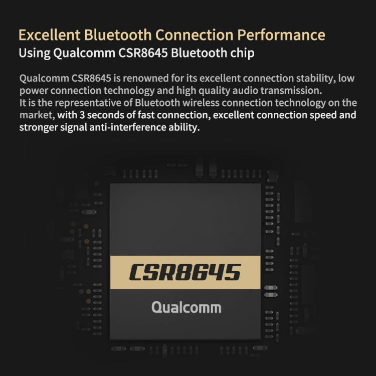 2. Qualcomm CSR8645 Bluetooth chip, with 3 seconds of fast connection, excellent reconnection speed and stronger signal anti-interference ability.