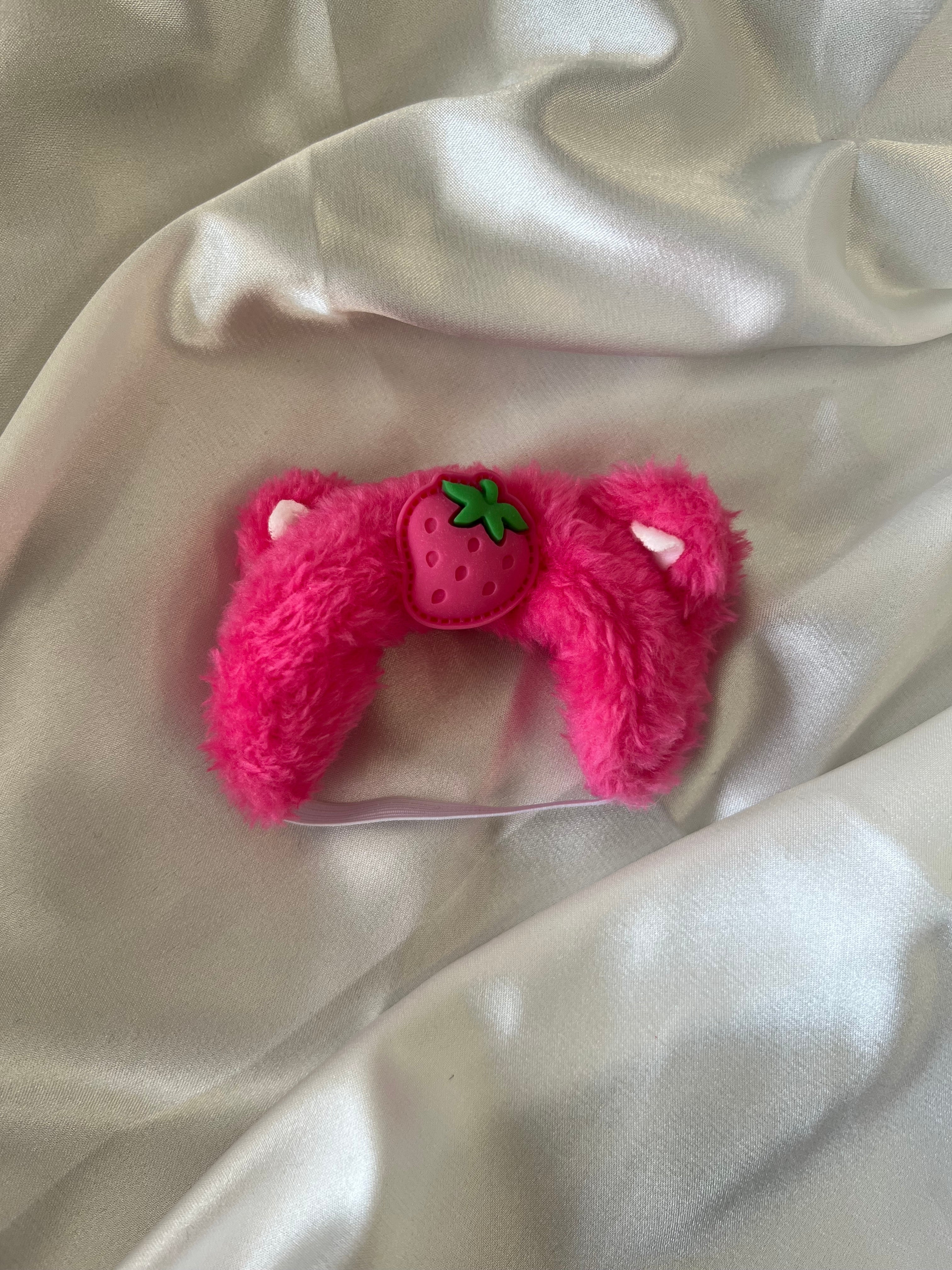 • Includes: Pink fluffy onesie, hooded ear warmer with strawberry charm