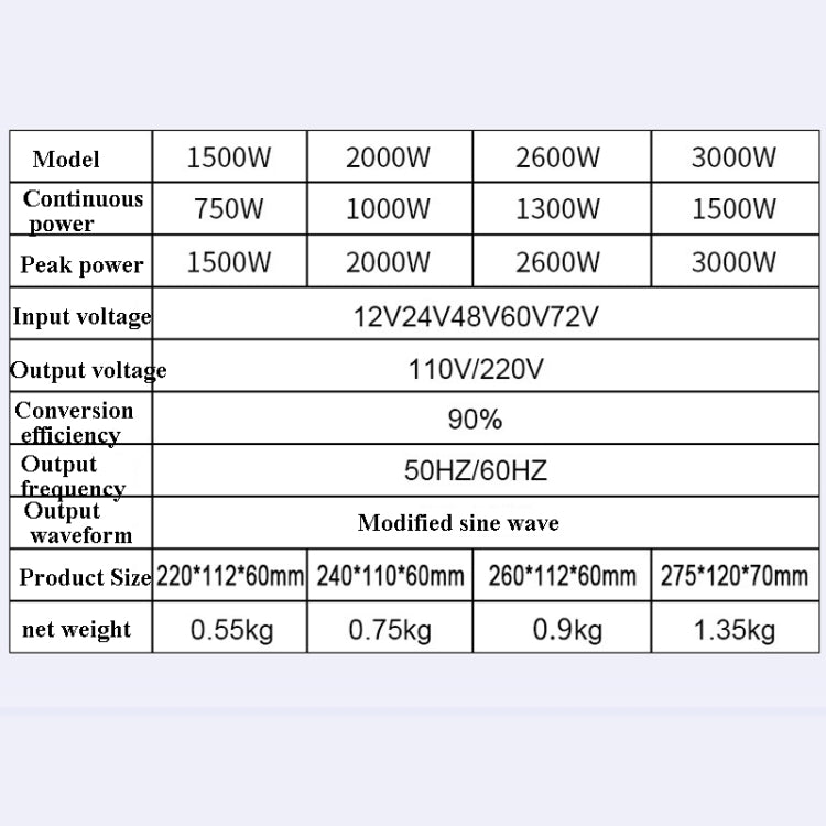 1. Input voltage: 12V24V48V60V72V2. Output voltage: 110V/220V3. Conversion efficiency: 90%4. Output frequency: 50HZ/6OHZ5. Output waveform: modified sine...