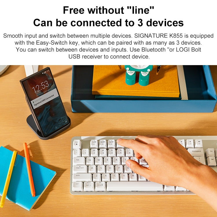 2. Unencumbered by cables, the keyboard can easily be moved around the desktop. Connect up to three devices and switch seamlessly via Bluetooth wireless technology or the included Logi Bolt USB receiver.