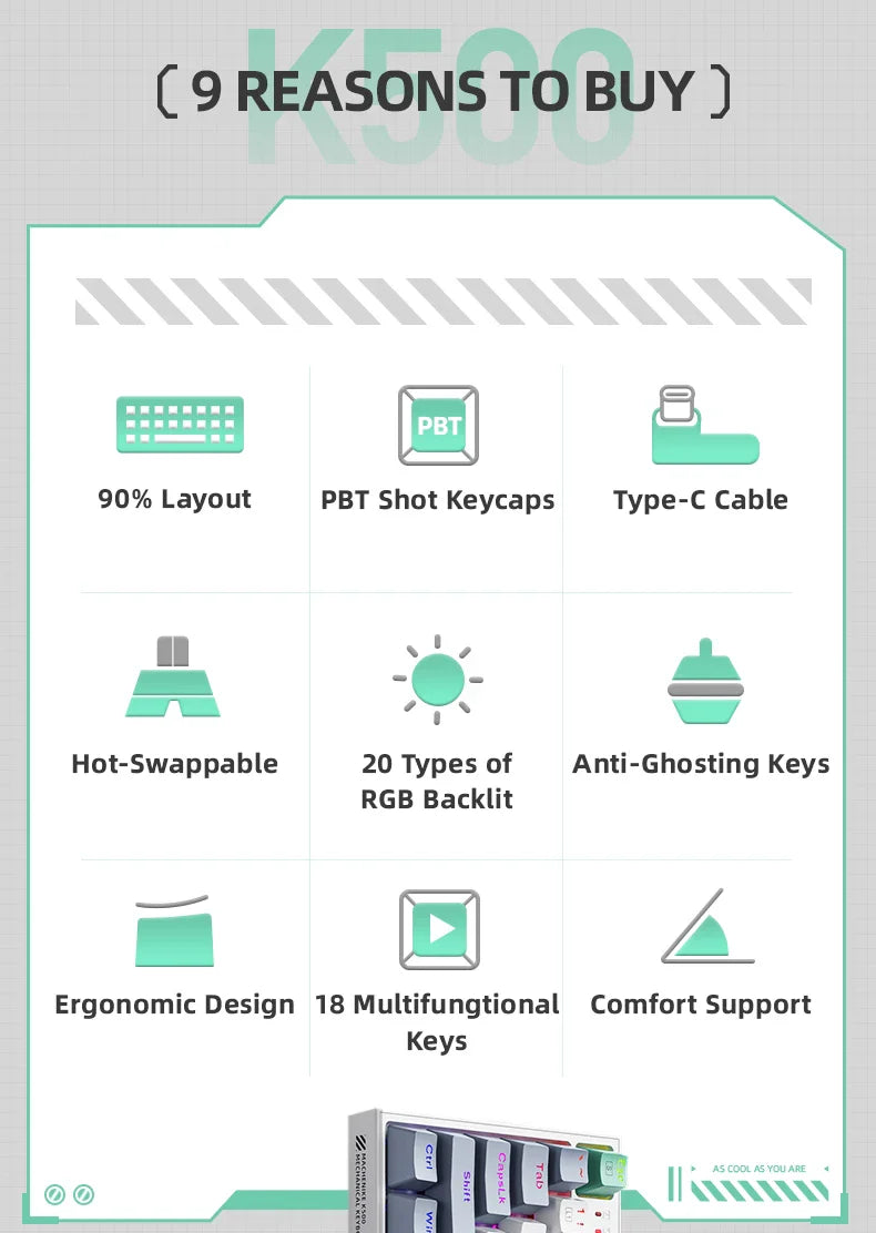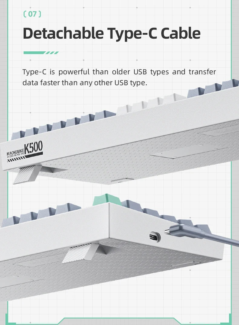 You can easily hot-swap every switch in a few seconds to customize your typing experience on the K500 without soldering.