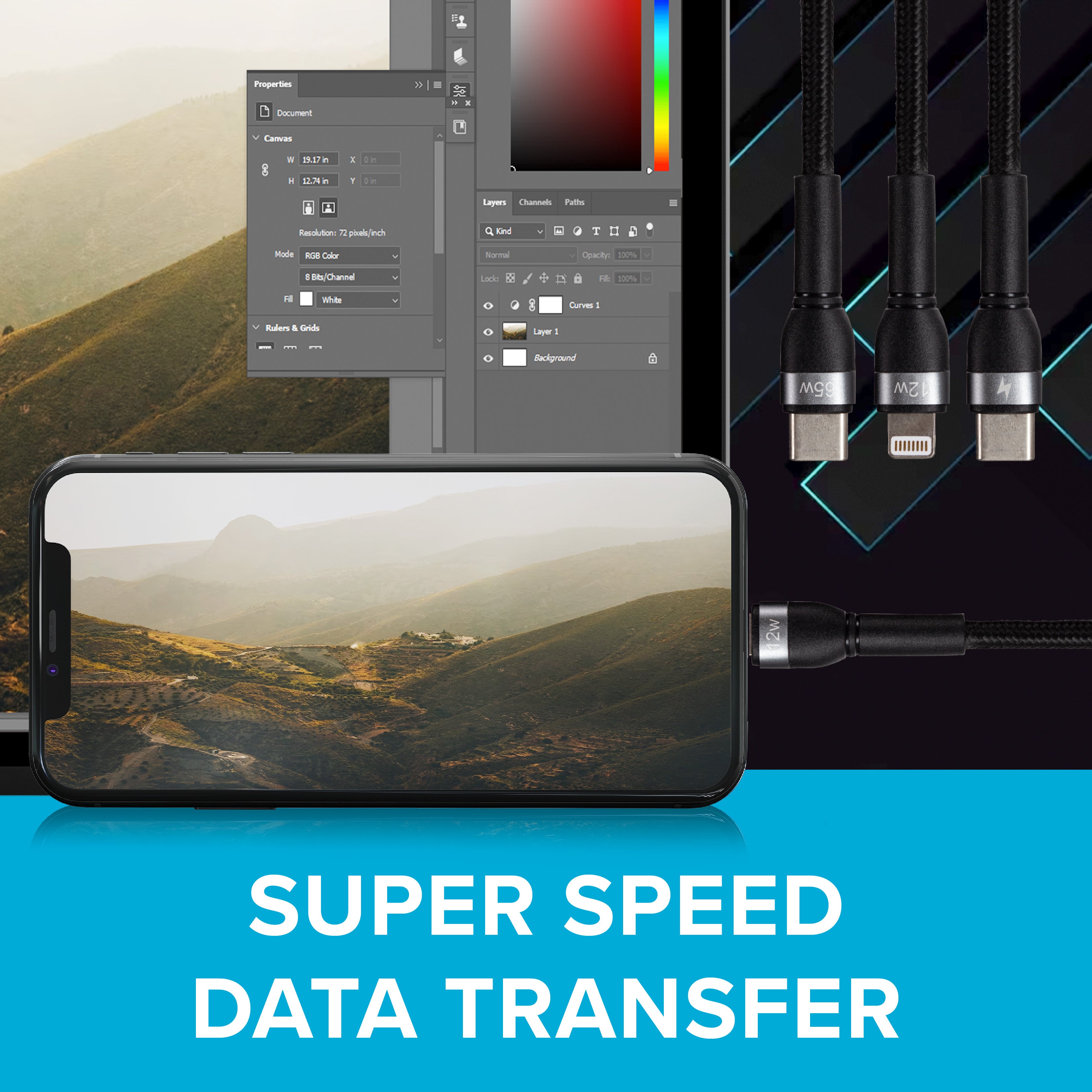 This extremely versatile Maplin 2-in-1 USB-C to Multi-Charging USB-C 65W & Lightning 12W Braided Cable allows you to connect USB-C to a USB-C and to a Lightning Connector, so you can use it for data transfer from all your devices or plug into a power adapter to charge. It is designed for the latest smartphones or tablets with USB-C connections and to iOS devices with a Lightning Connector. You can charge at super fast speeds, 65W when using USB-C to USB-C and 12W when connecting to the Lightning Connector.