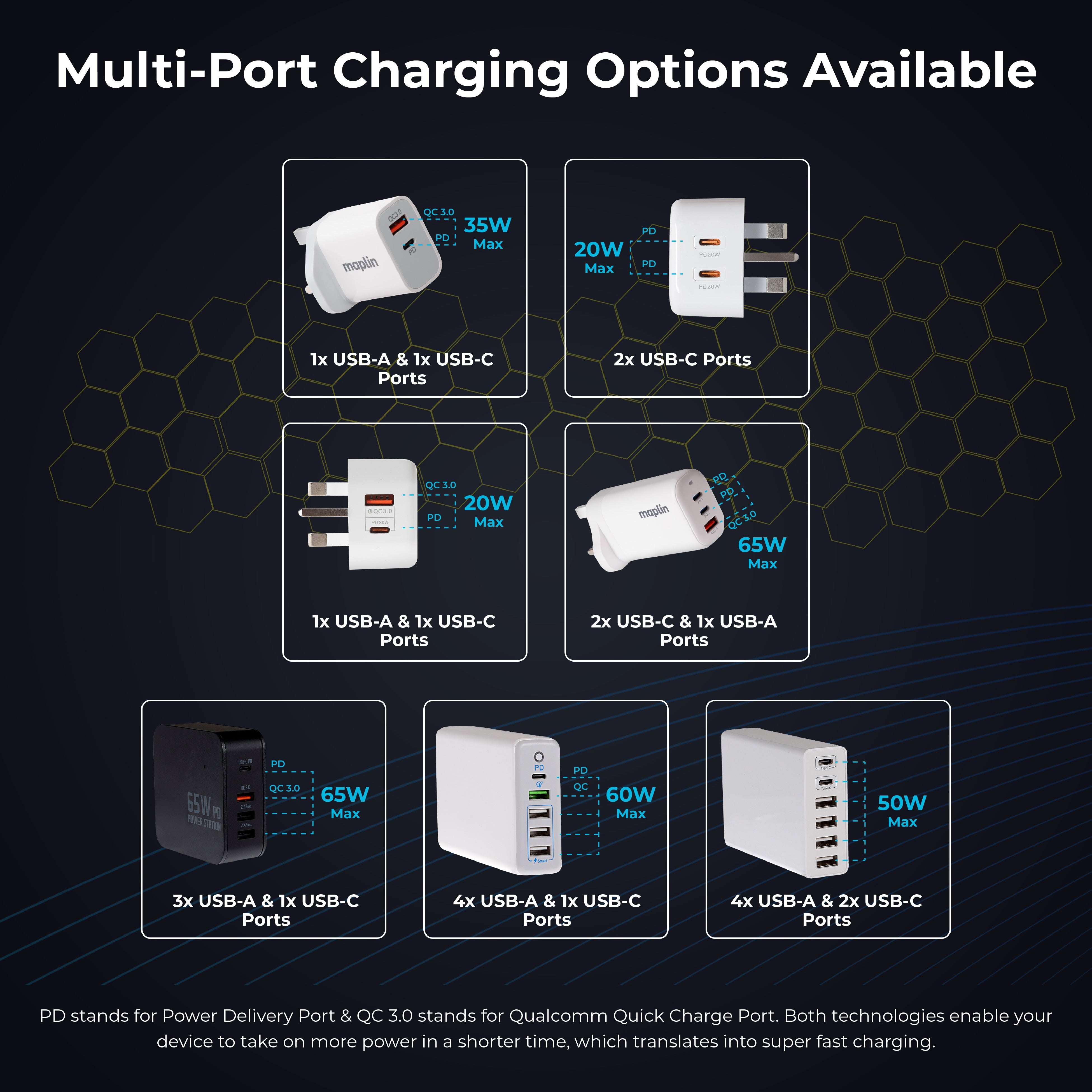 Designed to provide power to 65W Laptops and Tablets via USB-C, the Maplin 65W 2 Port USB Wall Charger 1x USB-A 1x USB-C GaN PD incorporates GaN Technology, PD and QC 3.0 high speed charging.