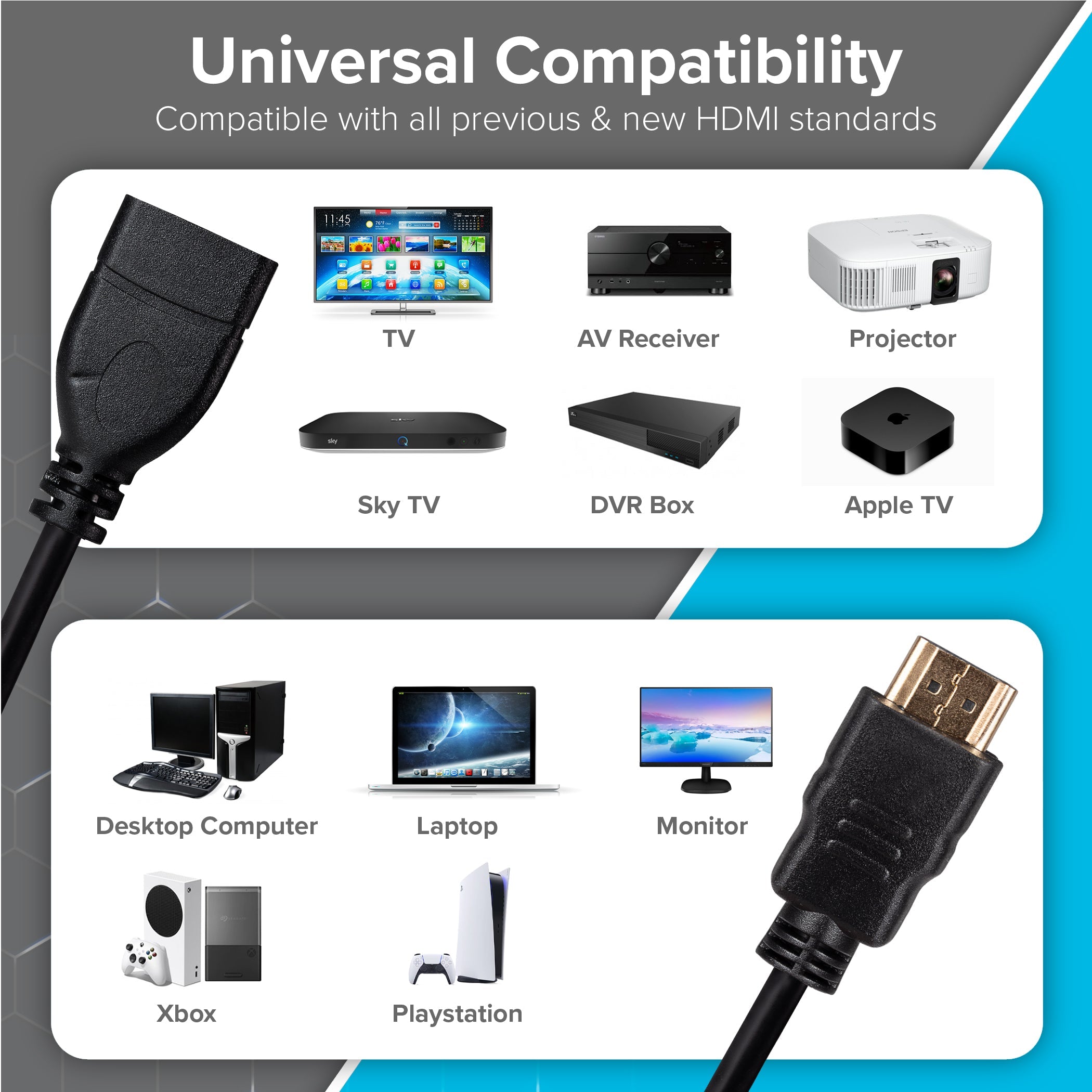 This Maplin HDMI Male to HDMI Female 4K Ultra HD Extension Cable is ideal for extending existing cables. HDMI is a highly versatile cable that combines high definition video and multi-channel audio into one cable. They are commonly used for connecting TVs to set satellite/cable boxes, Blu-ray/DVD players and game consoles. It's also used in PC connectivity and mobile devices.