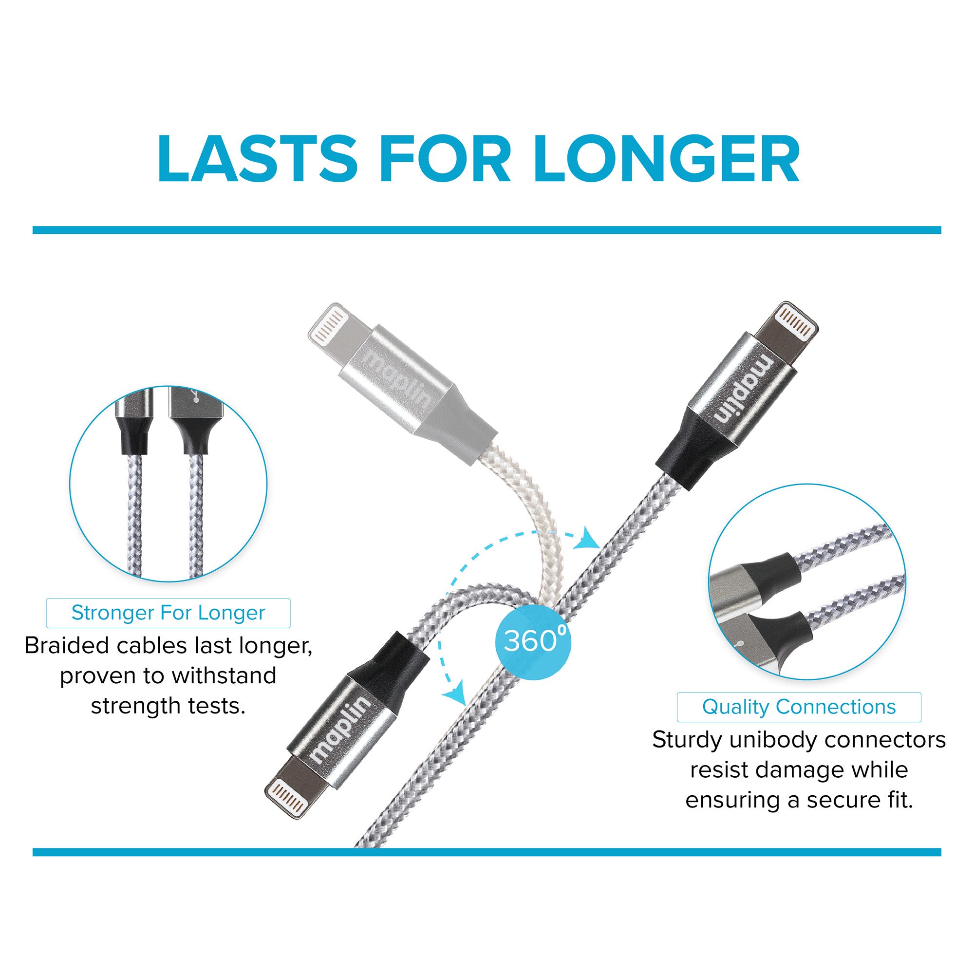 The Maplin Lightning to USB-C 20W High Speed Braided Cable has a TPE Sheath delivering the very highest quality connection for your devices for super fast charging and super speed data transfer. This cable is capable of 20 Watt charging and super speed data transfer from your Apple Lightning-enabled device. Connect to your PC for charging and data transfer, or to a USB-C power adapter for charging only.