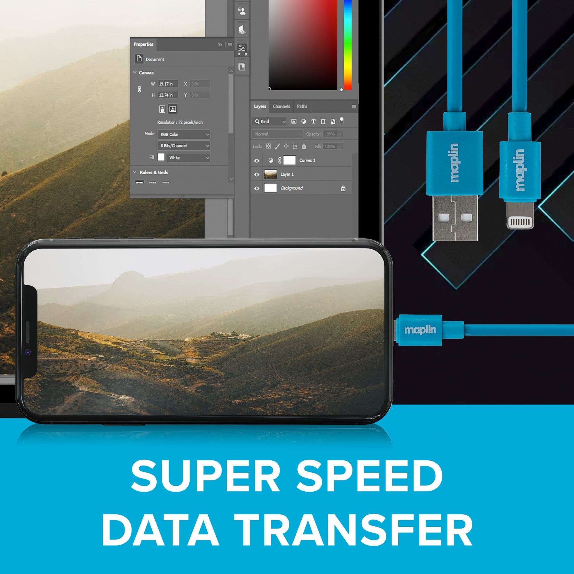 The Maplin Premium Lightning to USB-A Cable enables charging and data transfer from your Apple Lightning-enabled device. Connect to your PC for charging and data transfer, or to a USB power adapter for charging only