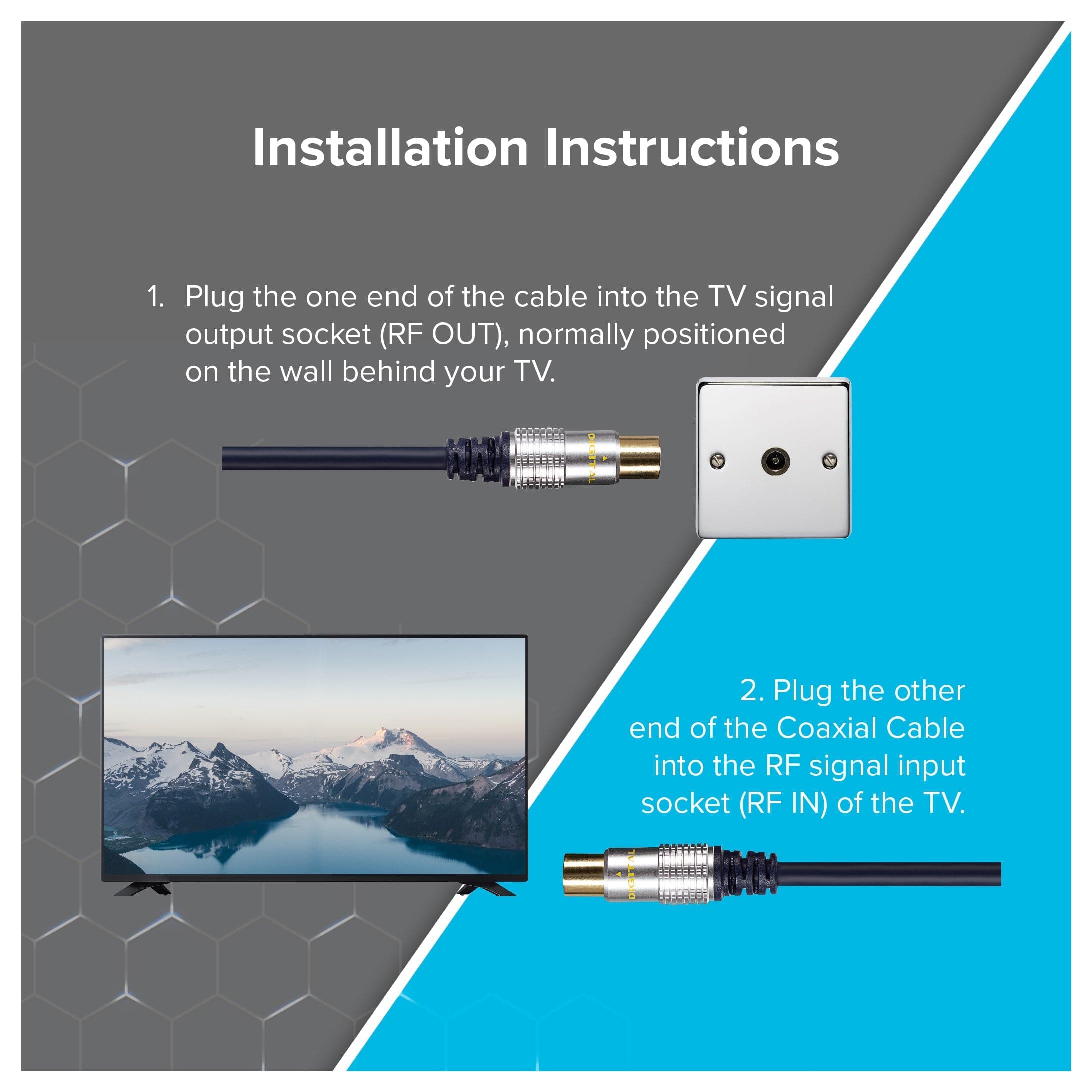 This Maplin TV Aerial Cable Coaxial RF Male to RF Male is commonly used to connect Freeview and set-top boxes to coaxial points on the wall. This is a Coax Plug (male) to Coax Plug (male) cable.