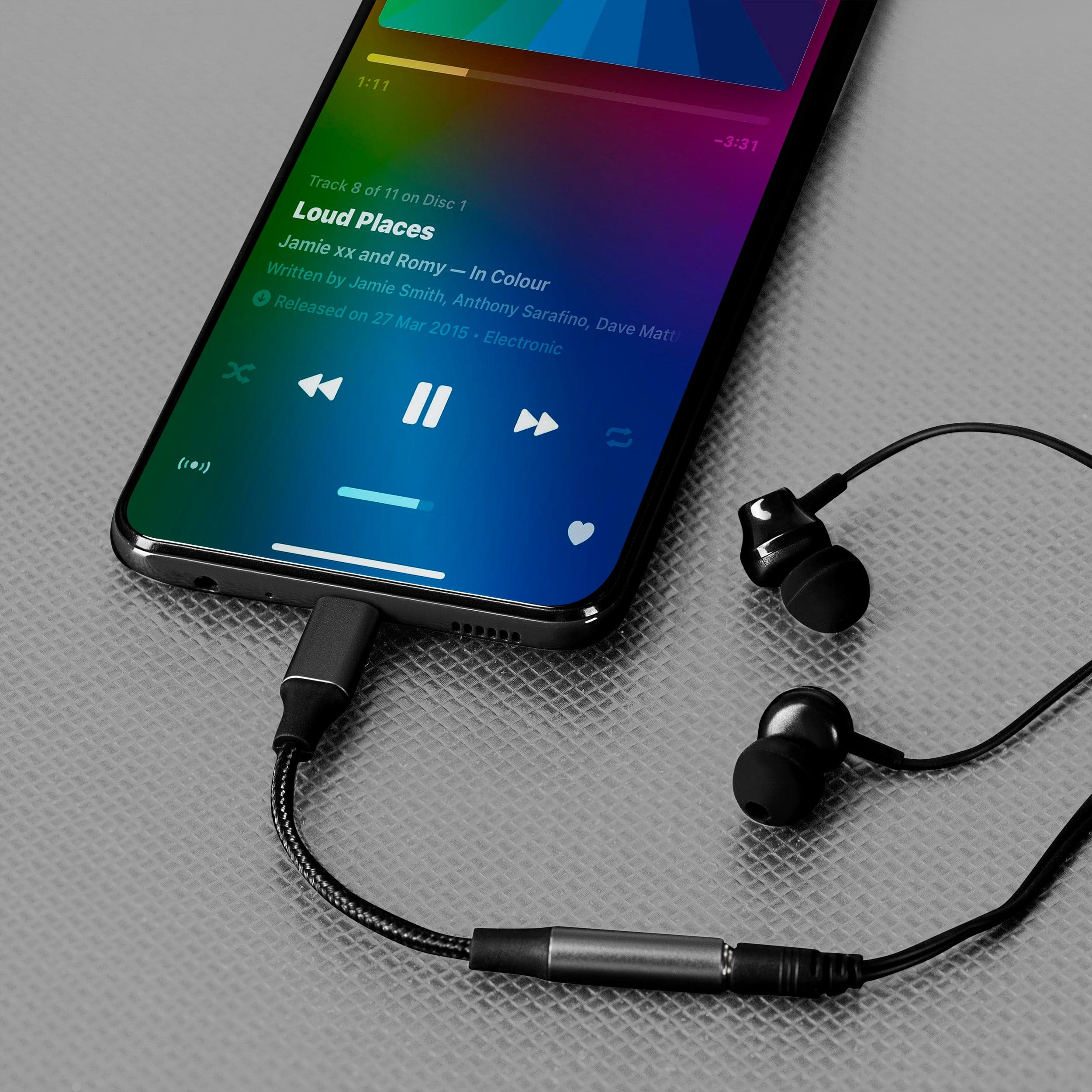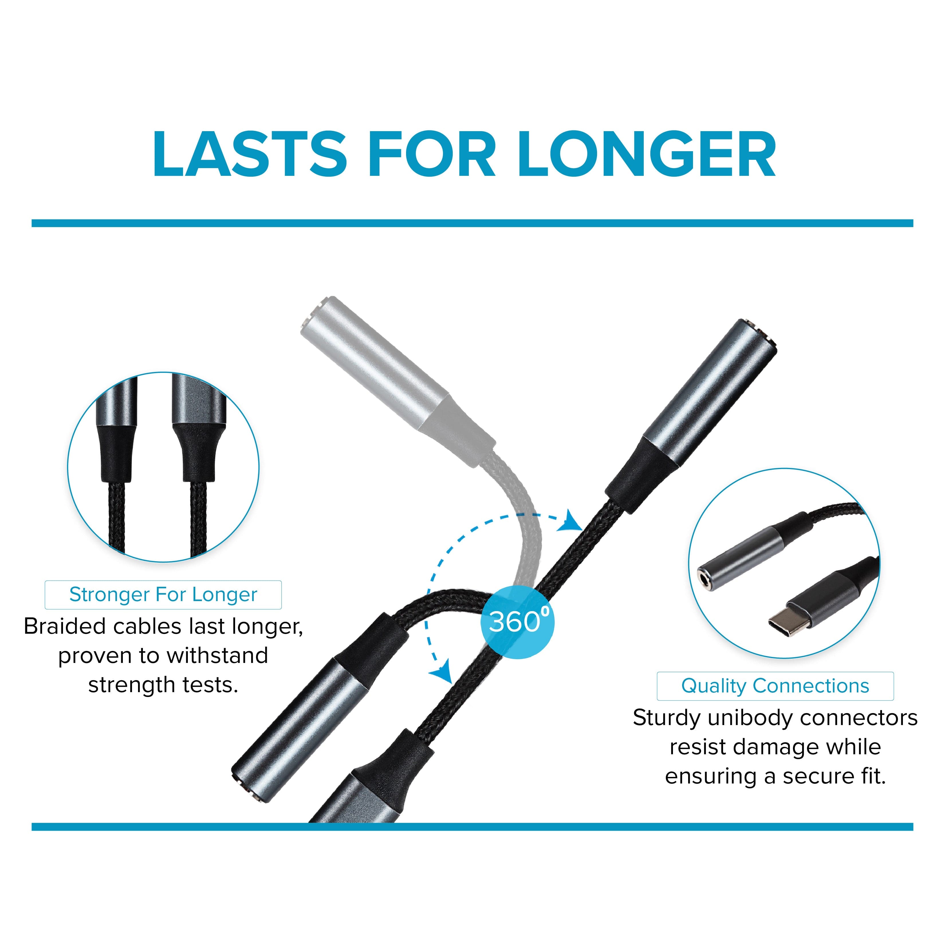 The Maplin USB-C to 3.5mm Female Jack Headphone Aluminium Braided Adapter Cable can be used to plug your existing headphones with 3.5mm jack into your USB-C device. For Audio only.