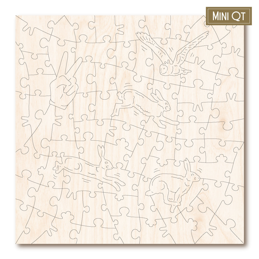 Our MINI QT puzzles are laser cut from thick, 4mm plywood and include 5 whimsies - they make a great puzzle snack!