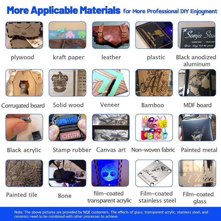 7. Can Engrave: MDF/Balsa/Paper/Wood/Fabric/Plastic/Leather/Plywood/Foam Paper/Anodized Aluminum