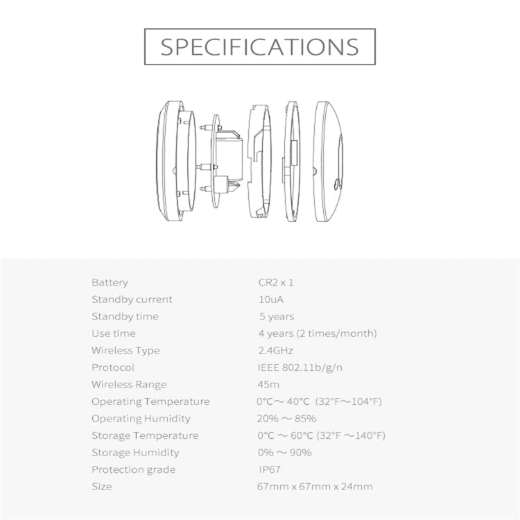 1. Beeps and send alert when a leak is detected 2. Battery: CR2 x 1 3. Standby time:2 years 4.... Read more
