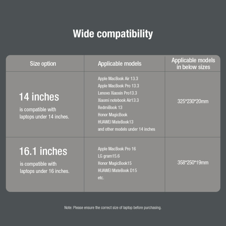6. Size: 14 inches: 365x260x27mm, 16 inches: 390x290x30mm