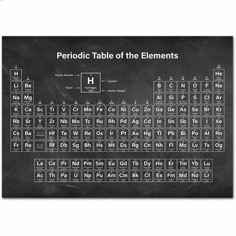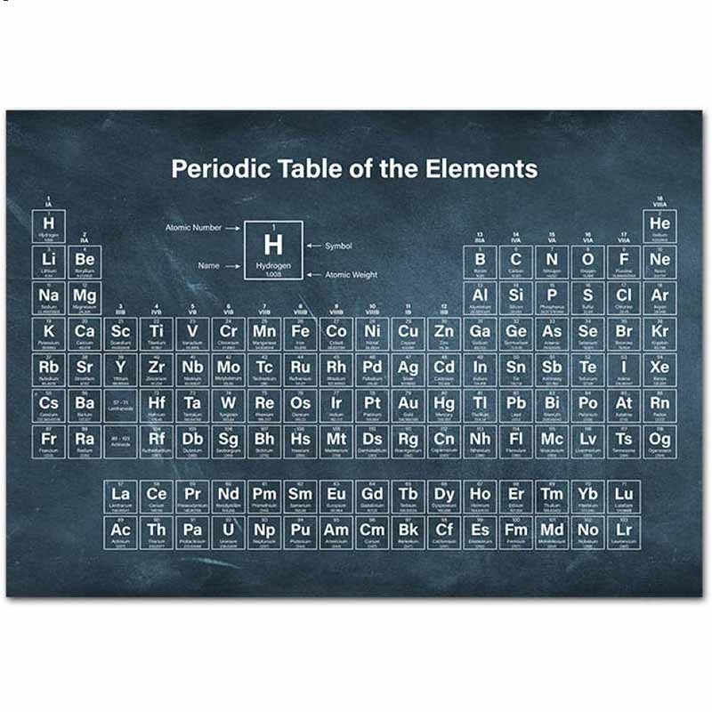This poster will give you the impression of being transported into a classroom or laboratory. The contrast of the white text on a dark background is reminiscent of white chalk on a slate board. A satisfying visual effect that makes this poster of Mendeleïev’s periodic table of elements particularly suitable for light-toned decors.