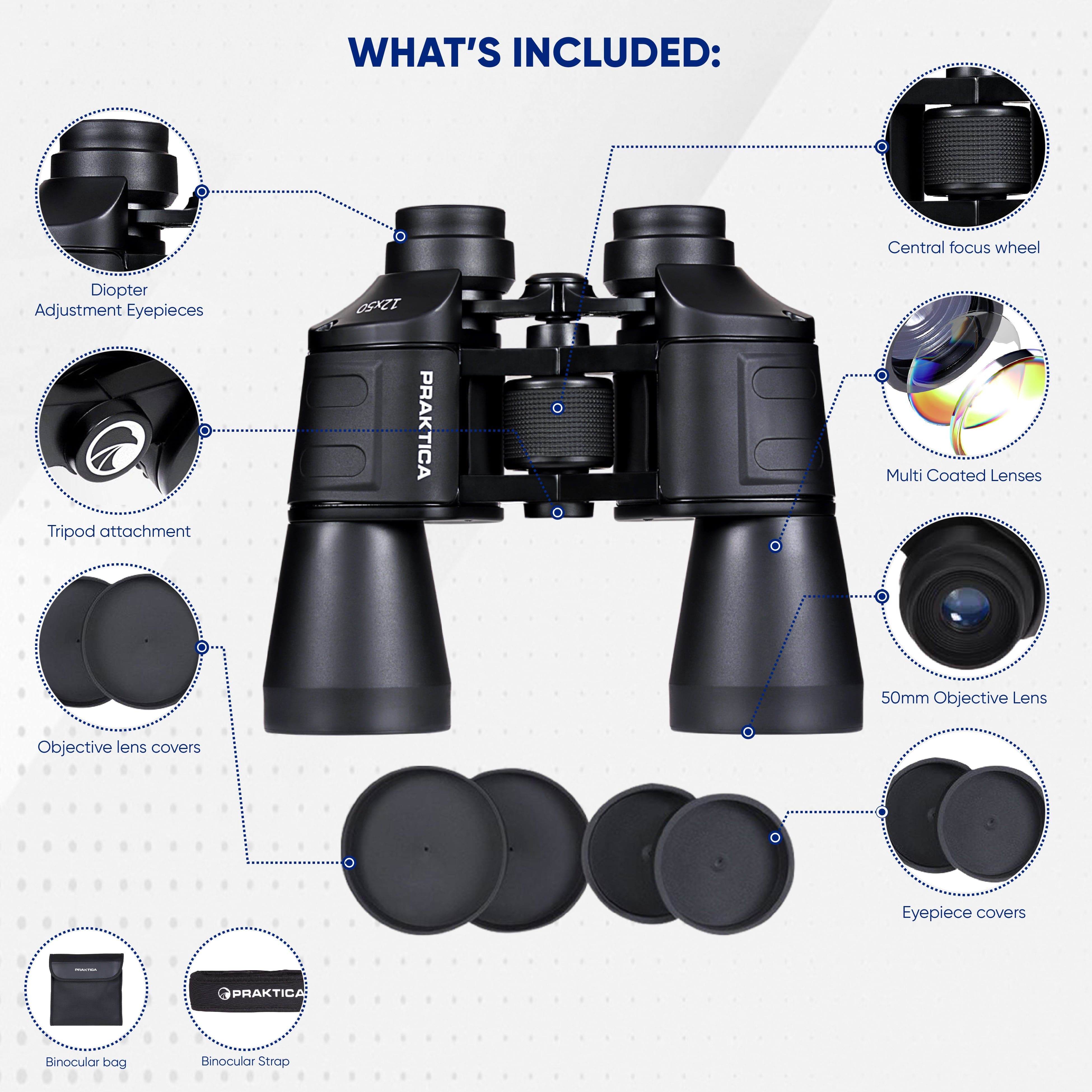 Fully loaded with features essential for days out in the field, the PRAKTICA Falcon 12x50mm Multi Coated Porro Prism Field Binoculars offer multipurpose optics at an economical price. Built with a coating system optimised specifically for contrast and focus, these 12x50mm binoculars maximise light transmission at all times of day. Whether you're viewing an animal on the horizon or star in the night sky, you will enjoy a large, smooth focus wheel and rugged non-slip body helping to locate your subject quickly and then follow with ease.