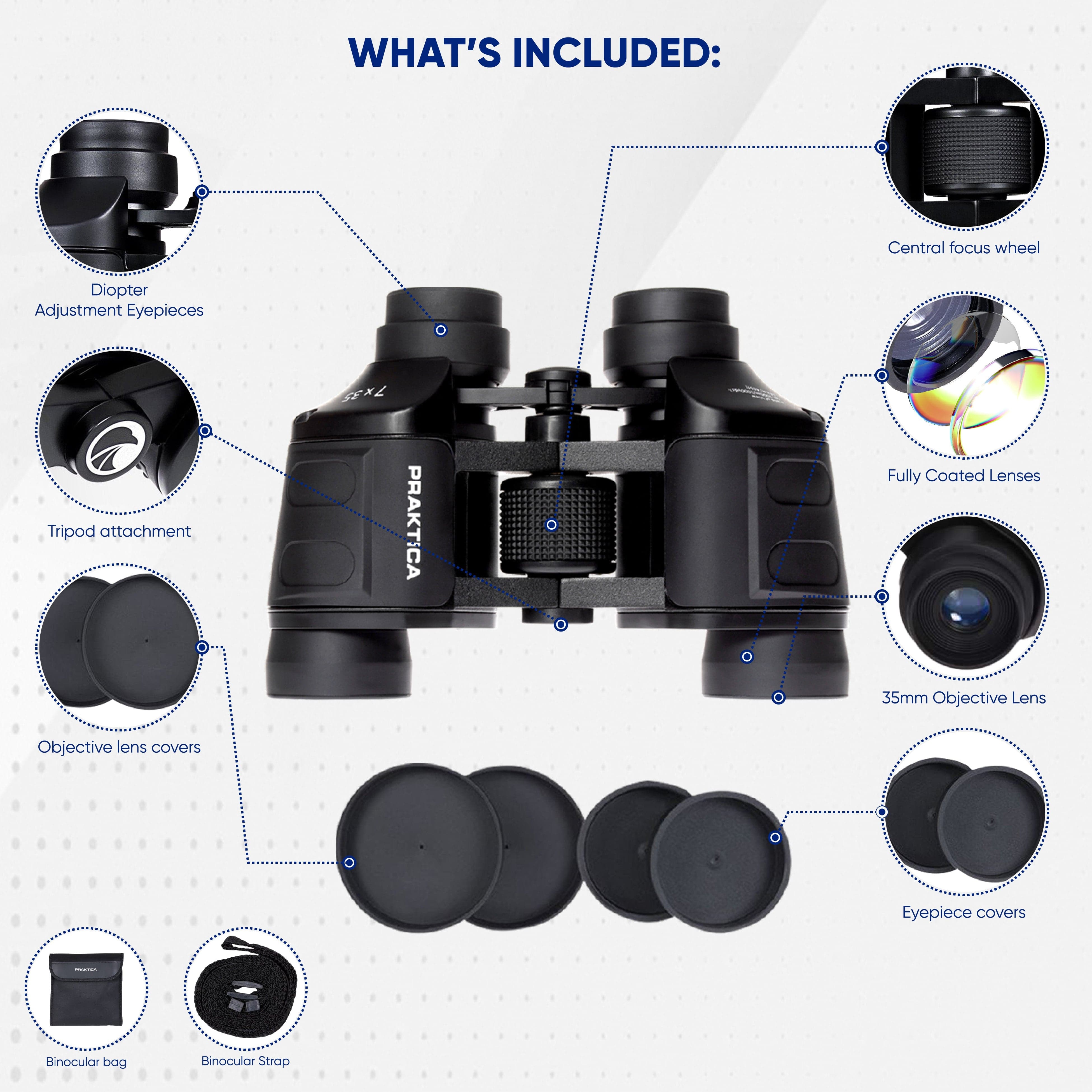 Fold Down Eyecups make the binoculars easily adjustable for more comfortable viewing for eyeglass and non-eyeglass wearers. Diopter Adjustment compensates for differences between your own two eyes. Additionally, attach your binoculars to a tripod using the PRAKTICA tripod adapter for extended viewing sessions.